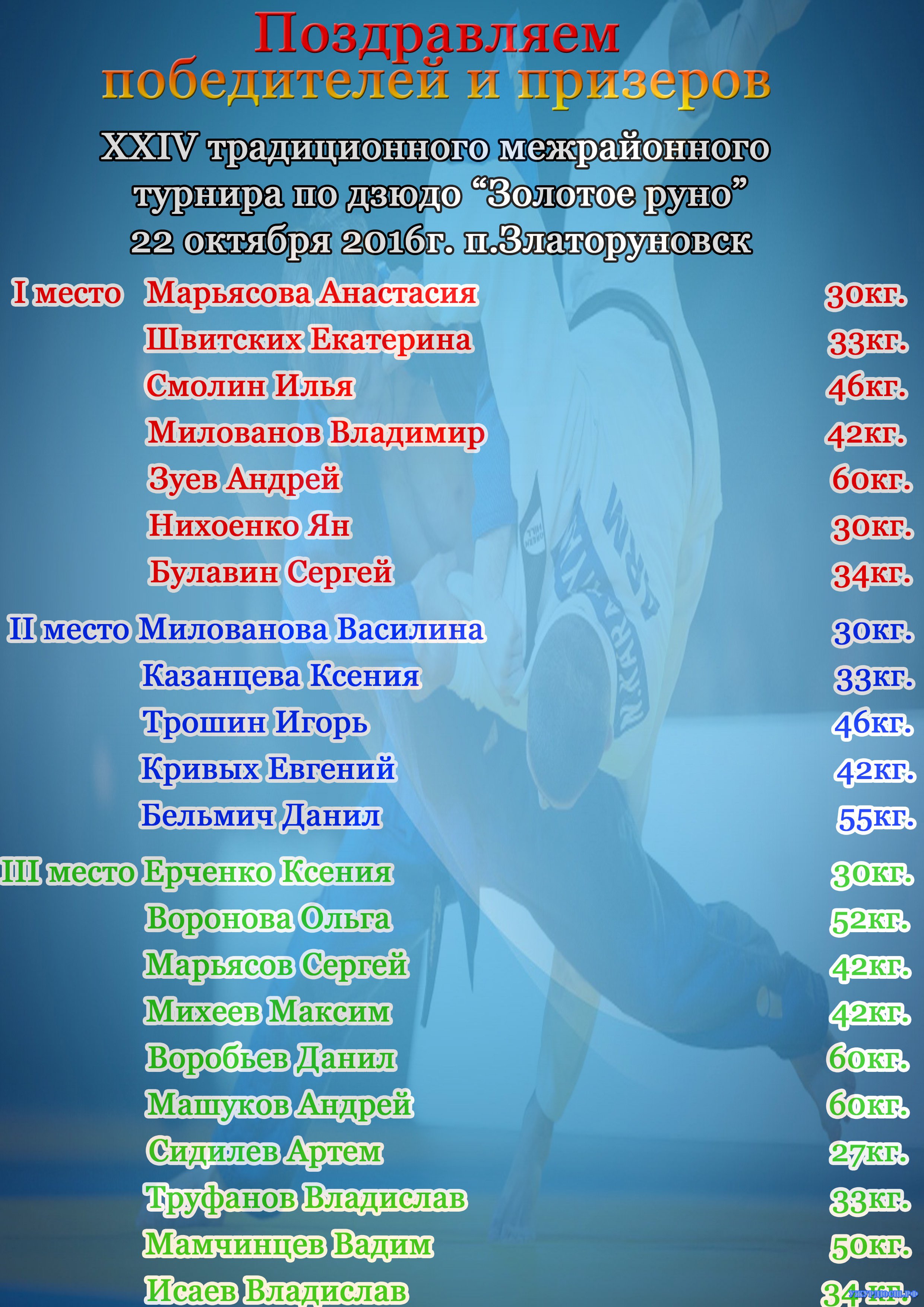22 октября 2016 года в спортзале сельского дома культуры п. Златоруновск прошёл XXIV традиционный межрайонный турнир по борьбе дзюдо. С приветственным словом перед борцами выступили заместитель главы Ужурского района по социальным и общим вопросам Богданова В.А., глава Златоруновского сельсовета Железняков С.И. и спонсор турнира генеральный директор ООО «Агрофирма «Учумская» Базаров А.О. Перед началом соревнований директор Ужурской спортивной школы Глушков А.С. вручил грамоты десяти лучшим борцам за 2015-2016 учебный год. В турнире приняли участие спортсмены из г. Красноярска, г. Назарово, г. Ачинска, г. Ужура, г. Шарыпово, ЗАТО п. Солнечный, п. Красноярское Загорье, п. Солгон, п. Копьёво, п. Курорт «Озеро Учум», п. Златоруновск. В борьбе за медали приняли участие 115 спортсменов разных возрастных групп. Команда Златоруновской секции была представлена 24 ребятами, 15 из них стали призёрами турнира. Победителями в своих весовых категориях стали Марьясова Настя, Смолин Илья, Милованов Владимир, Булавин Сергей (тренер: Богданов В.А.), Зуев Андрей (тренер: Матафонов К.А.), Швитских Екатерина (тренер: Комлева И.С.), Нехаенко Ян (тренер: Воробьёв С.А.). В копилке сборной команды Ужурского района 7 золотых, 4 серебряных, 10 бронзовых медалей. Отдельными призами от Ужурской спортивной школы были отмечены самый техничный борец, за самую короткую схватку и за волю к победе.