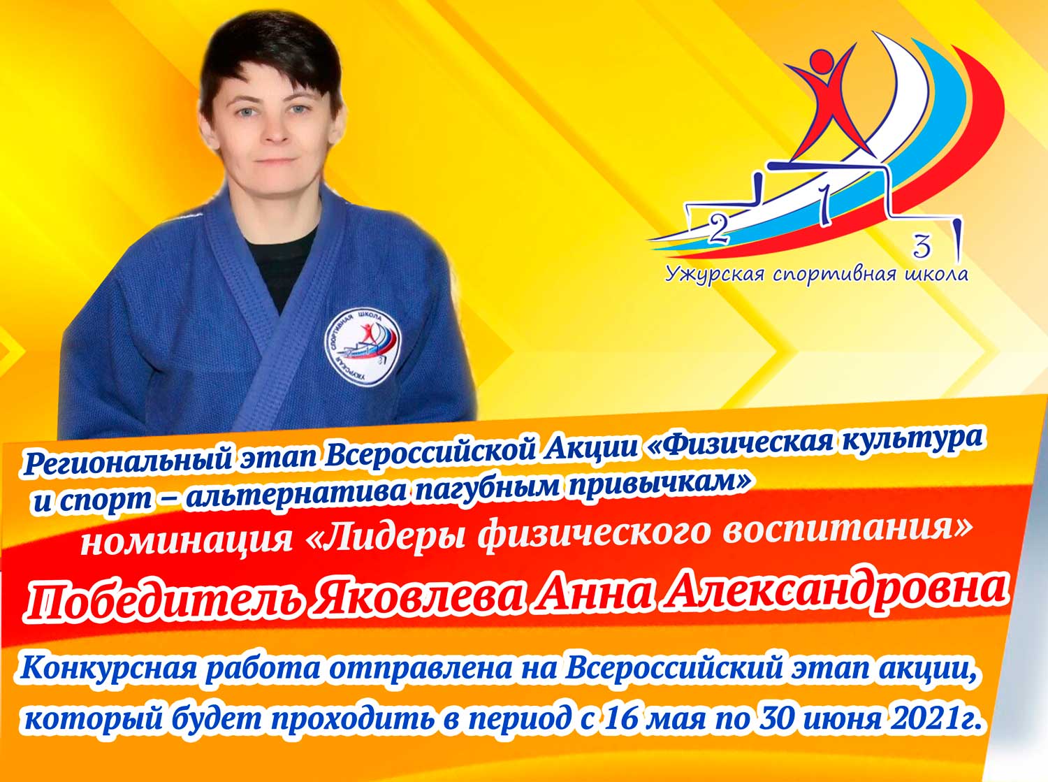 Подошел к концу региональный этап акции «Физическая культура и спорт – альтернатива пагубным привычкам». От нашего района, по итогам муниципального этапа акции, на региональный этап была отправлена конкурсная работа Яковлевой Анны Александровны-тренера-преподавателя по дзюдо, и стала ПОБЕДИТЕЛЕМ в номинации «Лидеры физического воспитания» регионального этапа акции «Физическая культура и спорт – альтернатива пагубным привычкам». Вот такая вот победа, в преддверии Дня Победы. Конкурсная работа Анны Александровны будет отправлена на Всероссийский этап акции «Физическая культура и спорт – альтернатива пагубным привычкам», который будет проходить в период с 16 мая по 30 июня 2021г. Желаем ей удачи!