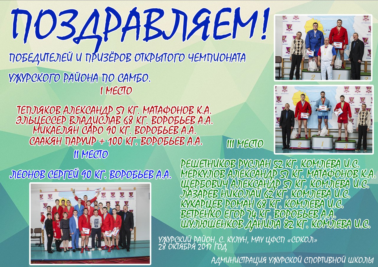 ПОЗДРАВЛЯЕМ!  ПОБЕДИТЕЛЕЙ И ПРИЗЁРОВ ОТКРЫТОГО ЧЕМПИОНАТА  УЖУРСКОГО РАЙОНА ПО САМБО.