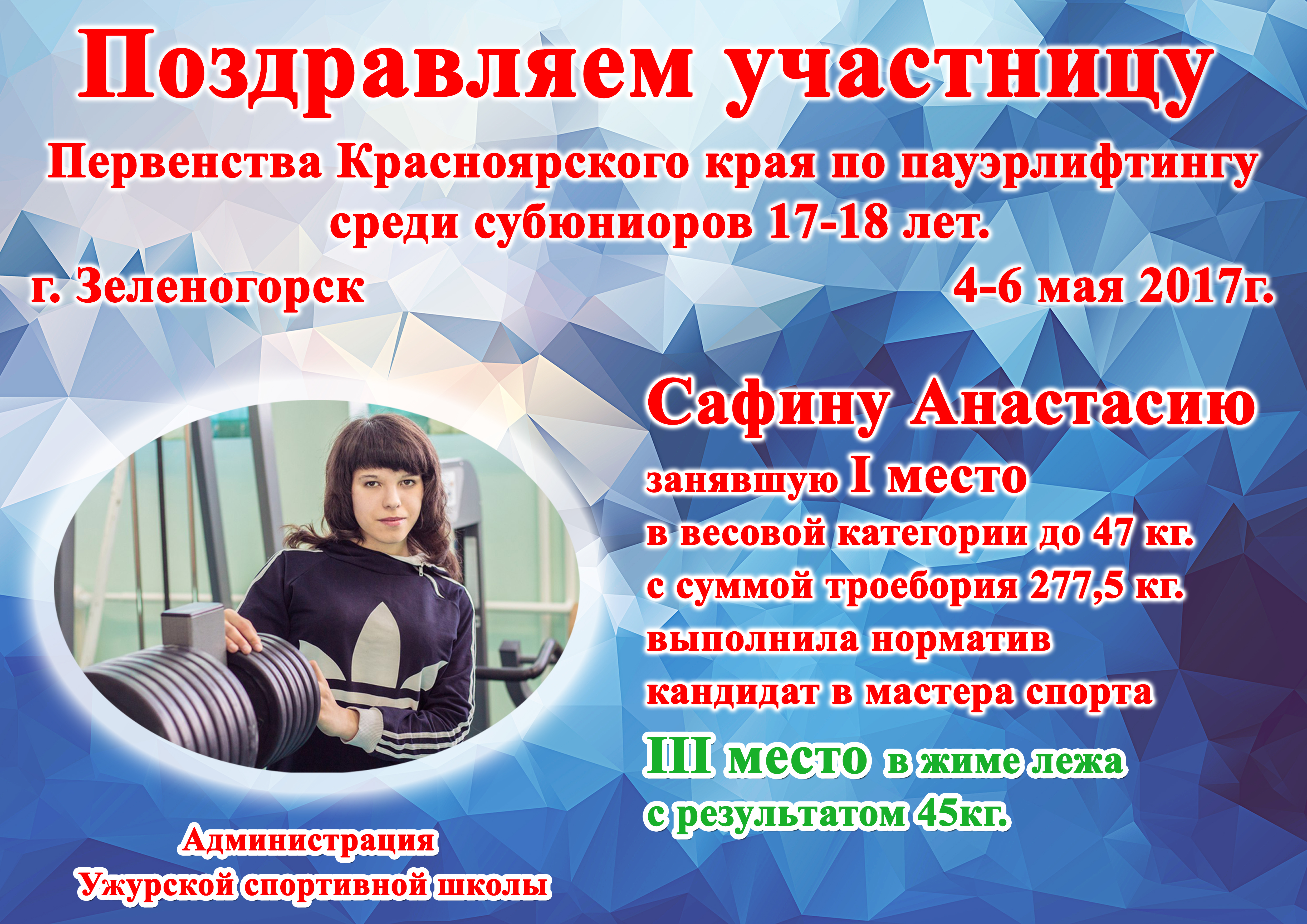 29 апреля 2017 года в ЦФСП «Сокол» прошли соревнования по безэкипировочному жиму лежа посвященные Дню Победы в Великой Отечественной войне 1941-1945 гг.